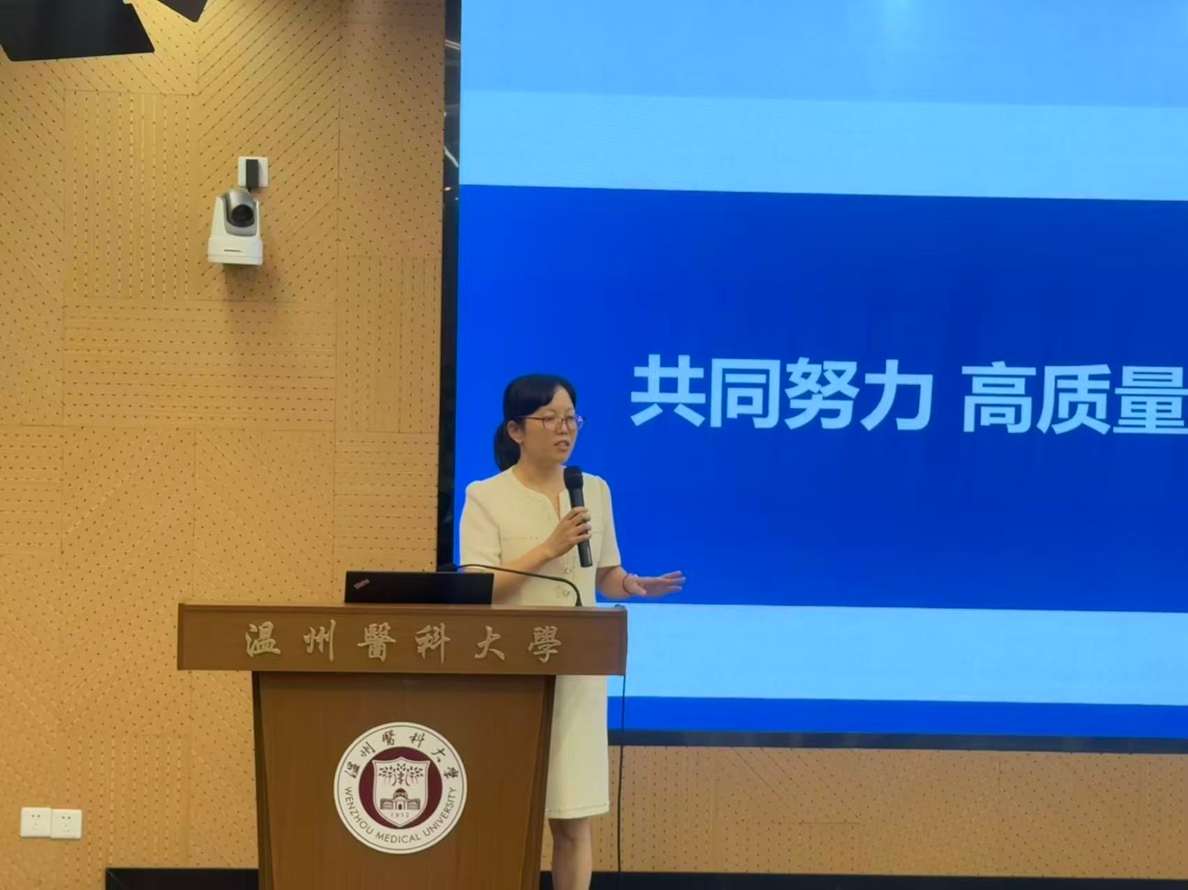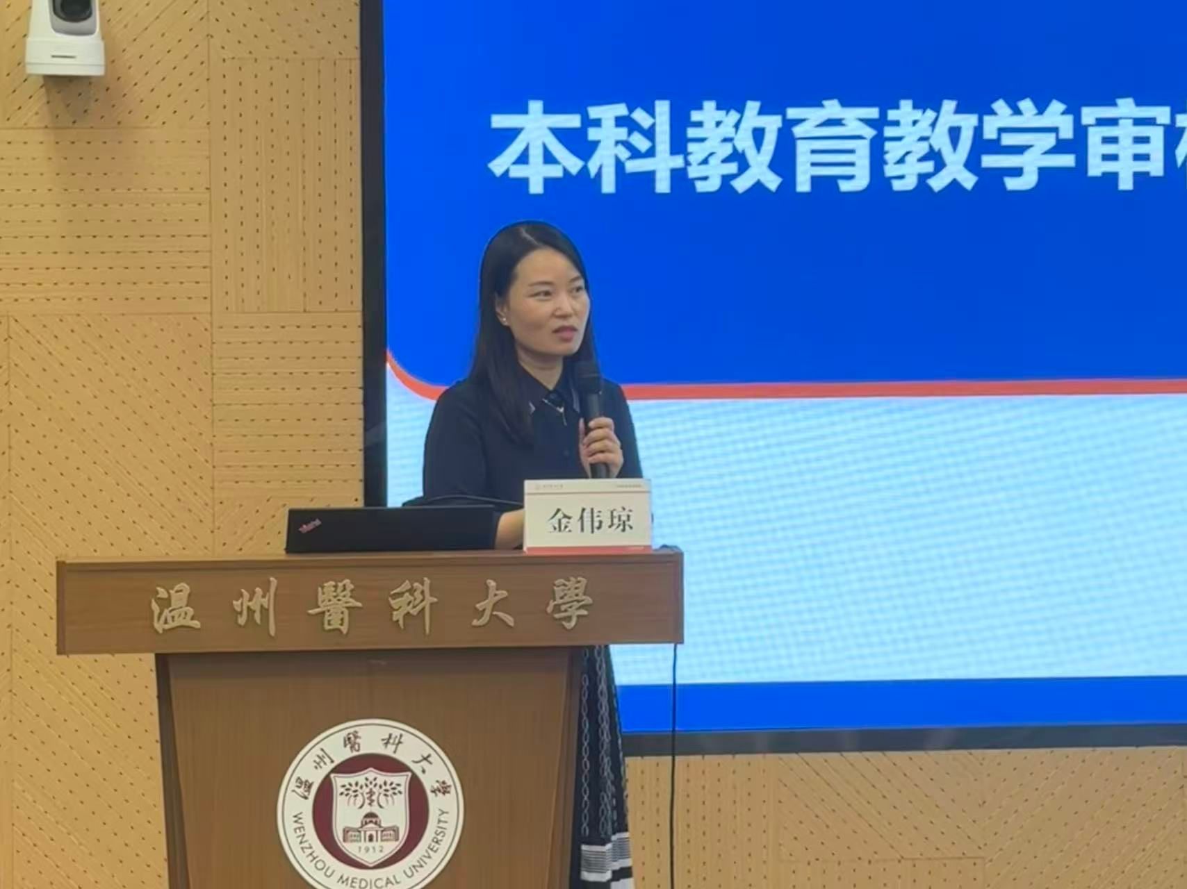首先,金伟琼围绕本科教育教学审核评估工作,从评估基本概况、学校自评报告及评估准备事项三个方面展开,为全体参会人员作了系统梳理与详细解读。她深入讲解了评估的核心内涵、考察重点与关键环节,明确了各项工作要求,为迎接教育部专家进校考察奠定了坚实基础。